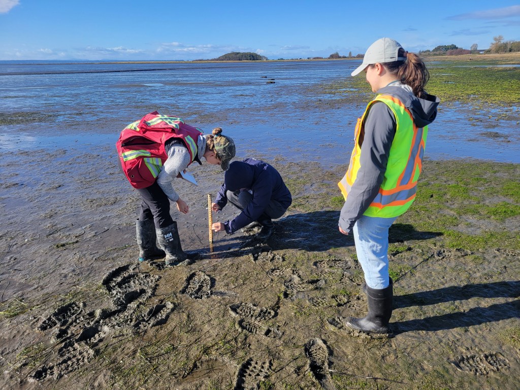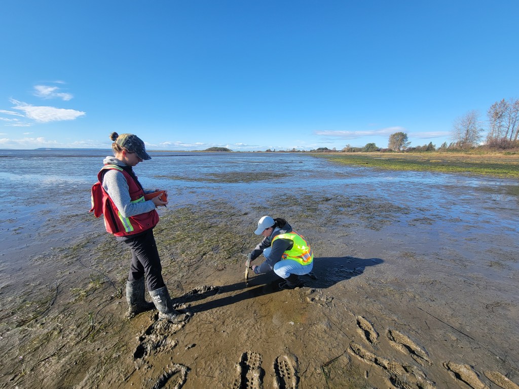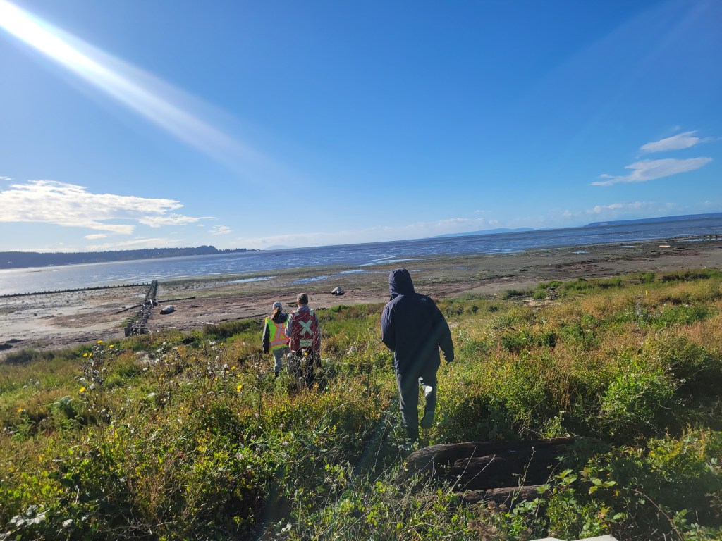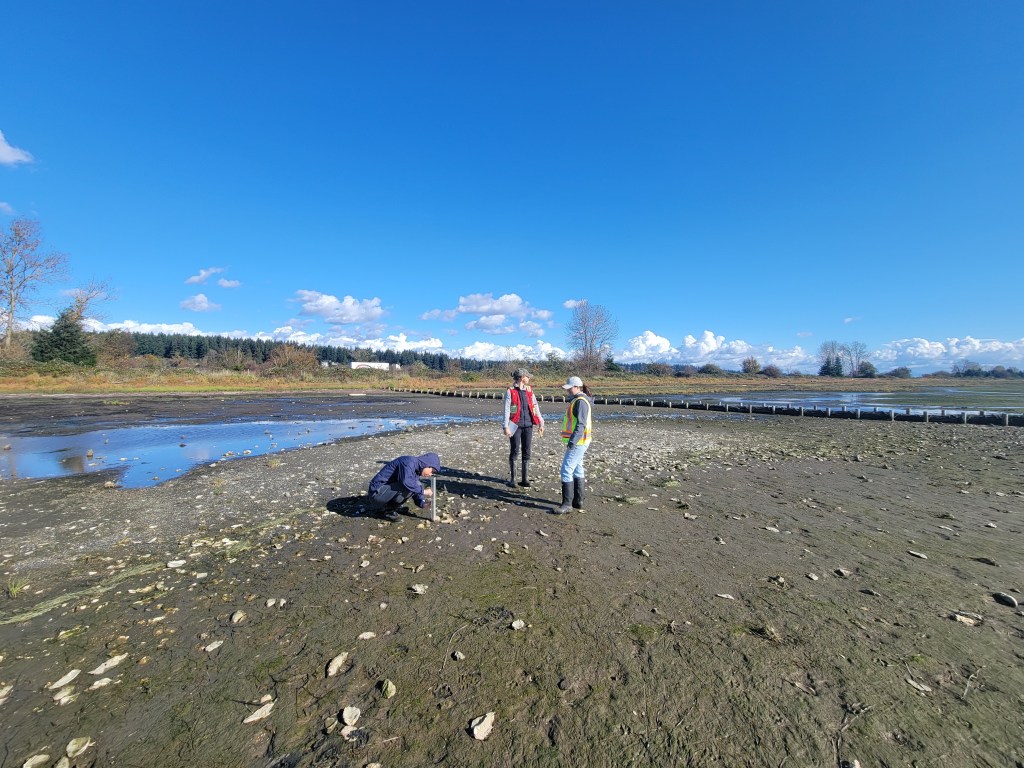 Aerls and Enda joined Jamie from Ducks Unlimited Canada and Marina from Queen’s University at the site of the Living Dike Pilot Project in Boundary Bay on 16th October 2024 to deploy an array of pressure sensors to monitor waves. Monitoring this nature-based pilot project will allow us to better understand how different features and components perform in response to storm wave action.
